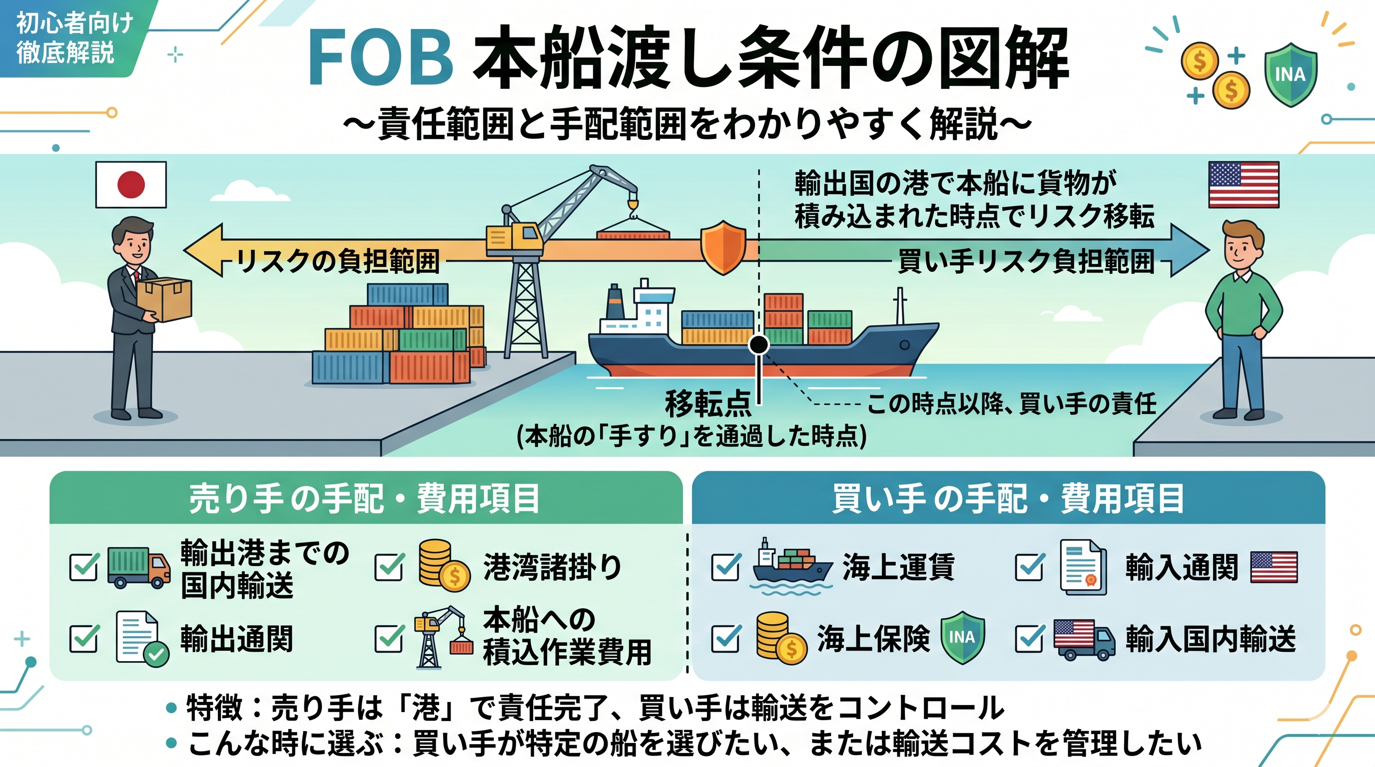 FOBは「本船渡し条件」と呼ばれ、貨物が船に積み込まれた時点で責任が輸入者へ移転します。